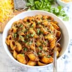 This 20 Minute Enchilada Pasta is a quick and flavorful dish combining the comforting textures of pasta shells with the rich, spicy flavors of red enchilada sauce and melted cheddar cheese. Ground beef, sautéed onions, and garlic infuse the dish with savory depth, making it a perfect weeknight meal that comes together effortlessly on the stovetop.
