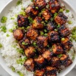 - Finish and Serve: Transfer the cooked salmon bites to a serving plate. Drizzle the reserved Bang Bang sauce over the top and garnish with finely chopped chives. Serve immediately.