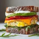 This Avocado Breakfast Sandwich is a quick and delicious morning meal that’s easy to customize. Featuring fluffy scrambled eggs, creamy avocado, crispy bacon, and melty cheddar on toasted whole grain English muffins, it’s perfect for a hearty yet healthy start to your day.