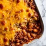 A hearty and comforting Baked Beans & Ground Beef Casserole that combines savory ground beef, sweet and tangy baked beans, and melted cheddar cheese. This easy-to-make dish is perfect for family dinners and packed with rich flavors from a combination of ketchup, brown sugar, mustard, and Worcestershire sauce, baked to bubbly perfection.