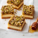 While the cheesecake chills, simmer honey and water to a rich syrup consistency. Stir in finely chopped pistachios and walnuts, lemon juice, and salt to create the classic baklava topping that harmonizes sweetness with nutty crunch. Pour this golden layer evenly over the cooled cheesecake bars, then cover and refrigerate overnight to meld all those glorious flavors.