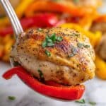 - Serve: Plate the baked chicken breasts and generously top with the bell pepper and shallot mixture. Spoon any remaining sauce over the chicken and serve immediately for a delicious, balanced meal.