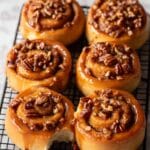 - Invert and serve: Let the buns rest in the pan for 5 minutes after baking, then carefully invert the pan onto a large serving tray or baking sheet to release the sticky pecan topping. Serve the buns warm for the best flavor and texture.