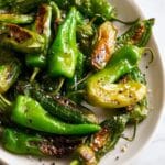 Arrange the peppers in a single layer in the hot skillet. Resist the urge to stir for the first couple of minutes; letting them sit undisturbed helps create those gorgeous blistered spots. After 1 to 2 minutes, toss the peppers occasionally until they are charred in spots and tender, around 8 to 10 minutes total. The blistering is what gives this recipe its signature irresistible texture and smoky flavor.