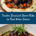 Tender, flavorful braised short ribs cooked slowly in a rich red wine and beef broth sauce with aromatic vegetables and herbs, resulting in melt-in-your-mouth meat perfect for a comforting dinner.