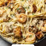 - Toss with Pasta and Serve: Optionally add a splash of reserved hot pasta water to the skillet to loosen the sauce if desired. Toss the drained fettuccine in the skillet with the Alfredo sauce, shrimp, and chicken. Serve immediately, garnished with extra Parmesan, chopped parsley, and a squeeze of lemon if desired.