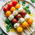 If you happen to have leftovers, store the skewers in an airtight container in the refrigerator for up to one day. It’s best to keep the olive oil and balsamic drizzle separate and add right before serving again to maintain freshness and texture.