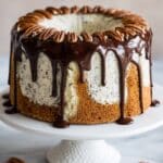 - Glaze and Garnish: Once the cake is cool, pour the caramel glaze evenly over the top, allowing it to drip down the sides. Garnish with additional chopped pecans if desired for extra crunch and decoration.