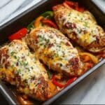 - Assemble: Place the seasoned chicken breasts evenly in a baking dish, then layer the sliced red and green bell peppers along with the sliced onions on top of the chicken.