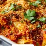 - Bake: Cover the baking dish tightly with foil and bake in the preheated oven for 35 minutes. Remove the foil and continue baking for an additional 5 to 10 minutes, or until the breadcrumb topping is golden brown and crispy. Remove from the oven and allow to cool slightly before serving.