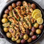 This Chicken and Potato Skillet recipe features tender, marinated chicken breasts paired with crispy golden baby potatoes. The chicken is marinated in a flavorful blend of olive oil, soy sauce, honey, Dijon mustard, and garlic, then seared to perfection alongside pan-fried potatoes. Finished with a sprinkle of fresh parsley and served with zesty lemon wedges, this dish is a wholesome, satisfying meal perfect for any weeknight dinner.