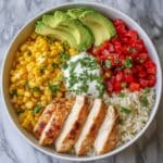 Now comes the fun part—layering your bowls. Start by dividing the cooked rice and black beans between bowls. Next, add the sliced chicken on top, followed by the sautéed veggies, and finally spoon over a generous amount of the fresh tomato and corn salsa. Don’t forget to garnish with fresh cilantro and a wedge of lime for squeezing over each bite.
