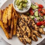 Mix Greek yogurt or sour cream with garlic powder, dried dill, lemon juice, salt, and pepper in a small bowl. Chill it until serving—it’s a cooling, herby sauce that pairs beautifully with both the spiced chicken and the crispy fries for an extra layer of flavor.