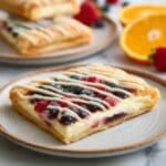 Delightful and flaky Cream Cheese and Berry Danish Pastries featuring a buttery puff pastry filled with a creamy sweetened cream cheese blend and topped with fresh mixed berries. These easy-to-make pastries are perfect for breakfast or dessert, boasting a golden crust and a luscious fruit glaze for added shine and sweetness.