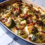This creamy baked Brussels sprouts recipe is a deliciously comforting side dish featuring tender Brussels sprouts enveloped in a rich, garlicky cream sauce, topped with melted Parmesan and mozzarella cheeses and optionally a crunchy breadcrumb topping. Perfect for holiday meals or any dinner where you want to impress with a cheesy vegetable bake.