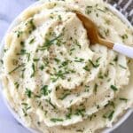 Transfer your mashed potatoes to a serving bowl and sprinkle with the fresh chopped chives if you like. The chives add a lovely fresh bite and a beautiful pop of green that makes the dish even more inviting.