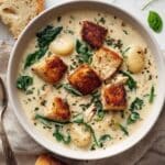This Creamy Chicken Gnocchi Soup with Garlic is a comforting and hearty dish perfect for a cozy meal. Tender diced chicken breasts are sautéed to a golden brown, then simmered with soft gnocchi, fresh spinach, garlic, and Italian seasoning in a rich, creamy broth. Ready in just 30 minutes, this soup combines the warm flavors of garlic and herbs with the satisfying texture of potato gnocchi for a delicious weeknight dinner.