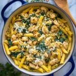 You can freeze this dish, but keep in mind that the cream sauce may separate slightly after thawing. For best results, freeze the chicken and spinach mixture separately from the pasta. When ready to eat, thaw overnight, reheat gently on the stovetop, then toss with freshly cooked pasta.