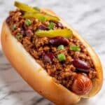This chili-topped hot dog pairs wonderfully with crispy fries, crunchy coleslaw, or a simple green salad to counterbalance the rich, meaty topping. For an even cozier meal, try serving alongside buttery cornbread or baked beans for those classic American comfort vibes.