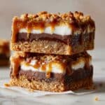 Due to the cream cheese and caramel, it’s safest to keep the bars refrigerated. Leaving them at room temperature for more than two hours is not recommended for food safety and to maintain their texture.