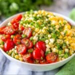 Pour the freshly made dressing over the corn and herb mixture. Gently but thoroughly toss everything together until every kernel and tomato is luxuriously coated. The dressing brings all the ingredients to life, melding the sweet corn, tangy tomatoes, and herbs into a harmonious, refreshing salad. You can serve it immediately at room temperature or refrigerate it to let the flavors marry further before serving.