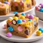 These Easter Cake Mix Cookie Bars are a colorful, festive treat perfect for spring celebrations. Made with a simple yellow or white cake mix combined with eggs, vegetable oil, and vanilla, these bars are studded with pastel M&Ms and sprinkles, giving every bite a fun and playful crunch. Baked until golden and cut into easy-to-serve bars, they are an effortless, crowd-pleasing dessert option.