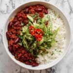 To finish, pile the hot chili beans over a bed of your choice of cooked white or brown rice. This simple step transforms the chili into a hearty, filling meal that’s ready in no time.