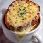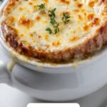 This classic Easy French Onion Soup features slowly caramelized sweet onions simmered in a rich beef broth with fragrant herbs, topped with toasted baguette slices and melted Gruyère cheese. Perfectly hearty, comforting, and full of deep flavors, this recipe serves 6 and can be made with or without white wine for an extra depth of taste.