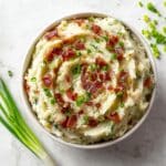 - Garnish and Serve: Transfer the colcannon to a serving dish and top with the remaining crispy bacon and optional thinly sliced green onions before serving hot.