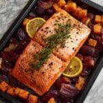 Reheat leftovers in a low oven (around 300°F / 150°C) until warmed through to retain the best texture. Avoid the microwave if possible, as it can cause the salmon to dry out and the vegetables to become mushy.