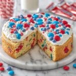 Want to elevate your presentation? Serve the cake on a rustic wooden board or colorful platter to highlight the bright sprinkles. You can also cut it into individual wedges and place each piece on mini dessert plates, perfect for sharing at summer parties or patriotic celebrations.