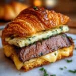 There’s something truly magical about the Garlic Butter Steak and Brie Croissant Melt Recipe that makes it more than just a meal—it’s a celebration of bold flavors and comforting textures wrapped up in one heavenly package. I can’t recommend enough giving this recipe a try soon; it’s perfect for impressing yourself or loved ones with minimal fuss but maximum joy. Enjoy every delicious bite!