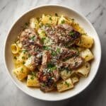 Garlic Butter Steak Tips with Cheesy Rigatoni is a delicious, hearty dish combining tender, juicy steak tips cooked in garlic butter with a creamy, cheesy rigatoni pasta. Perfect for a satisfying weeknight dinner, this recipe balances rich flavors with a comforting texture, making it a crowd-pleaser for steak and pasta lovers alike.