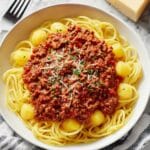 A rich and hearty Gnocchi Bolognese recipe combining tender gnocchi with a flavorful homemade Bolognese sauce made from lean ground beef, fresh vegetables, herbs, and crushed tomatoes. Perfect for a comforting family dinner, this dish brings together classic Italian flavors with a creamy Parmesan and fresh basil topping.