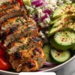 This Greek Avocado Chicken Salad is a fresh, vibrant, and healthy main course perfect for a light lunch or dinner. Combining tender cooked chicken breast with creamy avocado, juicy cherry tomatoes, crisp cucumber, tangy Kalamata olives, and crumbly feta cheese, it’s dressed with a zesty olive oil and red wine vinegar dressing infused with lemon juice and oregano. This no-cook Mediterranean-inspired salad is quick to prepare, gluten-free, low carb, and bursting with flavors and textures.