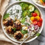Delicious and flavorful Greek Chicken Meatballs made with fresh herbs and spices, pan-fried to a perfect golden brown. Served over a bed of chopped romaine lettuce with feta, cucumber, tomato, white rice, and creamy tzatziki sauce, this dish offers a wonderful balance of taste and nutrition for a satisfying meal.