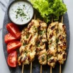 If you want to freeze, skewer the chicken before cooking and freeze raw in a sealed bag for up to 1 month. When ready, thaw overnight in the fridge and cook as directed. Avoid freezing the tzatziki or fresh veggies since their texture won’t hold up well after thawing.