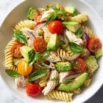 A refreshing and healthy chicken pasta salad featuring tender shredded chicken, creamy avocado, cherry tomatoes, and fresh basil, all tossed in a zesty Italian dressing made with white wine vinegar and extra virgin olive oil. Perfect for a quick lunch or light dinner, this salad balances vibrant flavors and textures in just 20 minutes.