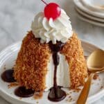 - Serve and garnish: Serve the fried ice cream immediately topped with whipped cream, honey or chocolate syrup, and a maraschino cherry if desired for extra flavor and presentation.