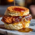 These Hot Honey Chicken Biscuits combine tender, crispy fried chicken with fluffy homemade biscuits and a sweet-spicy hot honey drizzle for a perfect balance of flavors. Crispy fried chicken cutlets soaked briefly in buttermilk are sandwiched inside soft, buttery biscuits and finished with a warm honey and hot sauce glaze for a delectable twist on a classic comfort food.