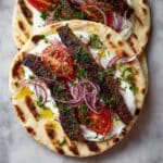Lay the warm flatbreads down and press them gently over the baked kebabs to absorb those rich cooking juices. Separate the strips along the scored lines and pile them onto the flatbreads. Top generously with garlic yoghurt sauce, tangy sumac onions, fresh tomato slices, and a sprinkle of chopped parsley. This is the perfect way to enjoy your Juicy Oven-Baked Kebabs with Sumac Onions and Garlic Yoghurt Recipe in all its glory.