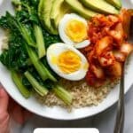 This Kimchi Rice Bowl with Jammy Eggs is a vibrant, flavorful dish combining creamy avocado sauce, perfectly soft-boiled eggs, sautéed bok choy, and tangy kimchi served over nutritious brown rice. It’s a wholesome, well-balanced meal that packs bold flavors and textures, ideal for a satisfying lunch or dinner.