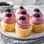 Keep leftover cupcakes in an airtight container at room temperature for up to two days, or store them in the fridge to extend freshness for up to four days. The blackberry frosting holds up nicely chilled but can feel softer at room temperature.