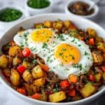 This Delicious Loaded Breakfast Hash combines crispy golden potatoes, savory ground breakfast sausage, and colorful bell peppers, topped with perfectly fried eggs and fresh parsley. It’s a hearty and flavorful morning meal that’s quick to prepare and sure to satisfy your breakfast cravings.