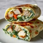 These Low Carb Cheesy Garlic Chicken Wraps come together in just 20 minutes, offering a deliciously cheesy and garlicky meal that’s perfect for a quick lunch or dinner. Wrapped in low-carb tortillas and pan-fried to golden perfection, these wraps are packed with shredded chicken, creamy cheeses, and fresh spinach for a satisfying low-carb option.