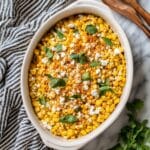 - Garnish and Serve: Generously sprinkle the corn mixture with Cotija cheese, the remaining teaspoon of chili powder, and chopped cilantro for freshness. Serve immediately to enjoy the best texture and flavor.