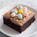 Spread your rich cocoa frosting generously over the cooled brownies. Now comes the fun part: gently crush the mini chocolate eggs and sprinkle them generously across the top. These pretty, colorful candies add crunch and a whimsical touch that makes these brownies honestly irresistible to everyone around!
