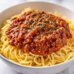 This recipe freezes beautifully! Separate the sauce and cooked spaghetti or freeze them combined in freezer-safe containers. Use within 2 to 3 months for the best quality and flavor. Thaw overnight in the fridge before reheating.