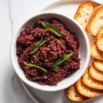 This Olive Sun-Dried Tomato Tapenade is a vibrant and savory Mediterranean spread made from Kalamata olives, sun-dried tomatoes, capers, garlic, and fresh parsley. Perfect as an appetizer or sandwich spread, it’s quick to prepare with no cooking required and offers a delightful combination of briny, tangy, and herbaceous flavors.