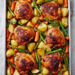 - Arrange on baking sheet: Spread the vegetables evenly in a large rimmed baking sheet. Nestle the seasoned chicken thighs on top of the veggies for even cooking.